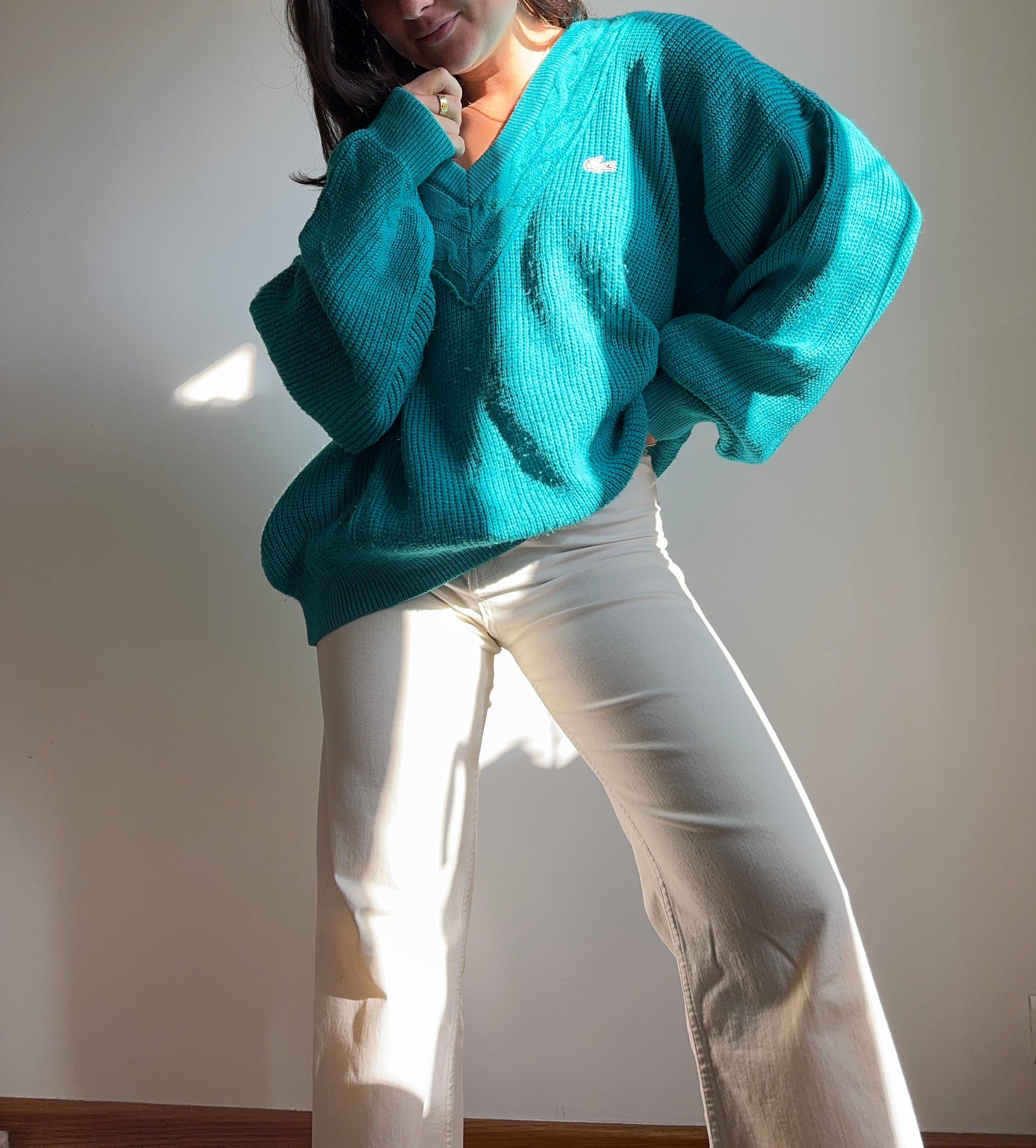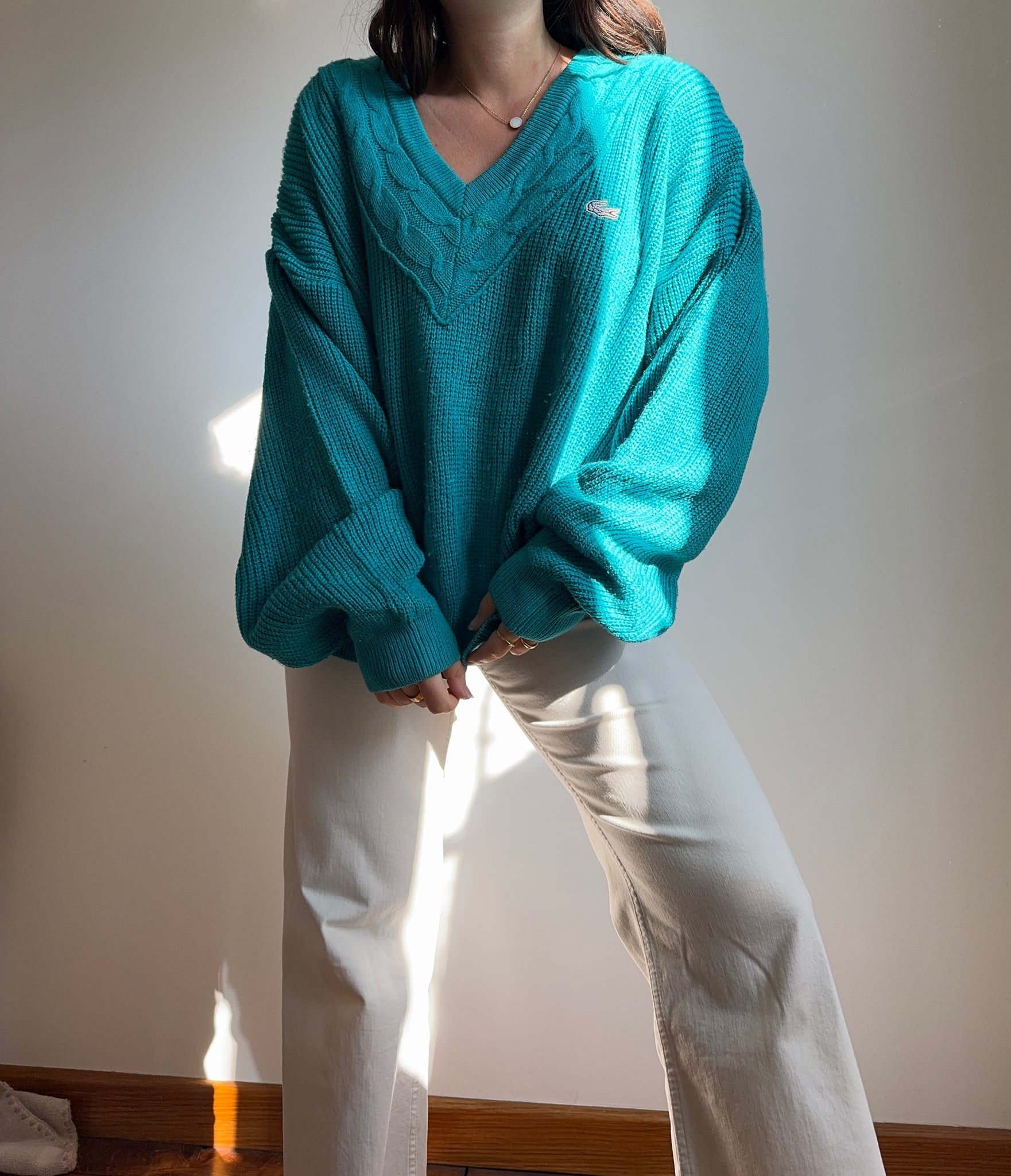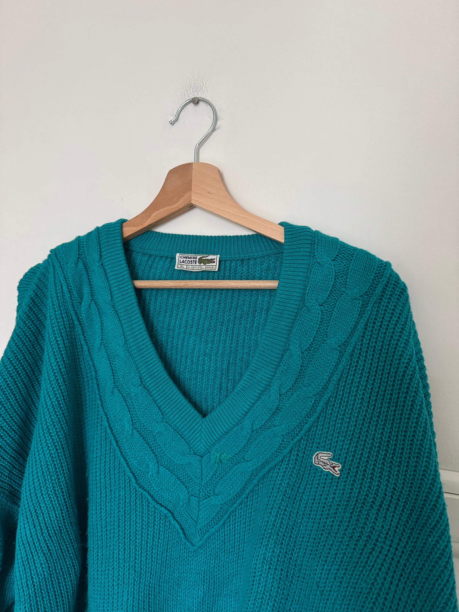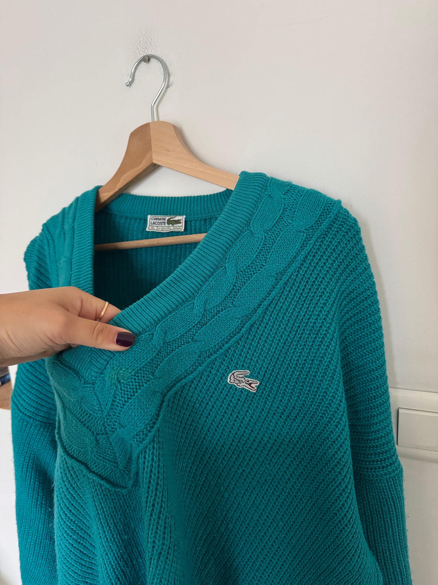 Pull col V Lacoste en grosse maille des années 80' - XL